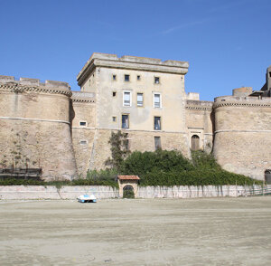 Forte Sangallo, commissionato nel 1501 da papa Alessandro VI Borgia ad Antonio da Sangallo il Vecchio, ha un valore centrale nell'evoluzione delle strutture difensive a cavallo fra il Quattrocento e il Cinquecento. La fortezza è impostata su di un blocco tronco piramidale di circa 40 metri di lato, interamente avvolto da una camicia in laterizi di recupero. Percorrendo la marciaronda in direzione sud est, si arriva alla torre di avvistamento seicentesca e alle annesse stanze del corpo di guardia che hanno subito pesanti manomissioni prima negli anni Venti e poi tra gli anni Sessanta e Settanta del secolo scorso. Realizzato il consolidamento statico delle murature esistenti, ormai lacunose, il restauro conservativo ha inteso restituire al manufatto la sua facies originaria.